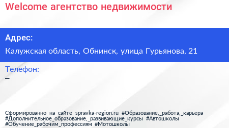 Welcome, агентство недвижимости по адресу Калужская область, Обнинск, улица Гурьянова, 21 в дальнейшем Организация, размещена в следующих категориях: