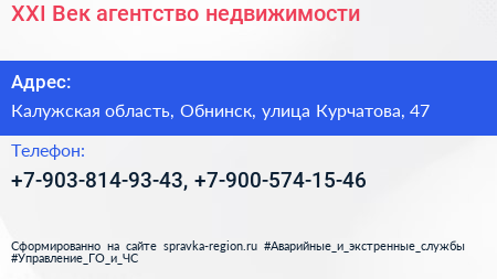 XXI Век, агентство недвижимости по адресу Калужская область, Обнинск, улица Курчатова, 47 в дальнейшем Организация, размещена в следующих категориях: