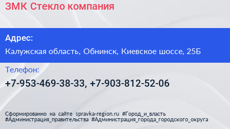 ЗМК Стекло, компания по адресу Калужская область, Обнинск, Киевское шоссе, 25Б в дальнейшем Организация, размещена в следующих категориях:
