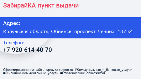 ЗабирайКА, пункт выдачи по адресу Калужская область, Обнинск, проспект Ленина, 137 к4 в дальнейшем Организация, размещена в следующих категориях:
