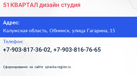 51 КВАРТАЛ, дизайн-студия по адресу Калужская область, Обнинск, улица Гагарина, 15 в дальнейшем Организация, размещена в следующих категориях: