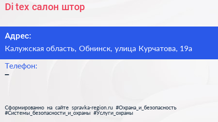 Di-tex, салон штор по адресу Калужская область, Обнинск, улица Курчатова, 19а в дальнейшем Организация, размещена в следующих категориях: