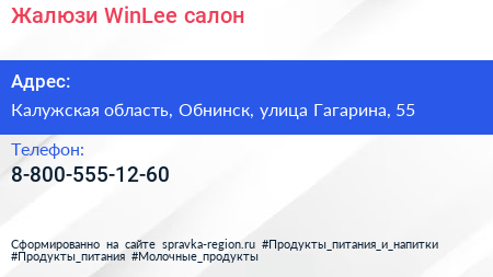 Жалюзи WinLee, салон по адресу Калужская область, Обнинск, улица Гагарина, 55 в дальнейшем Организация, размещена в следующих категориях:
