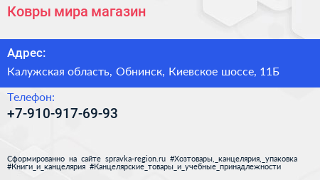 Ковры мира, магазин по адресу Калужская область, Обнинск, Киевское шоссе, 11Б в дальнейшем Организация, размещена в следующих категориях: