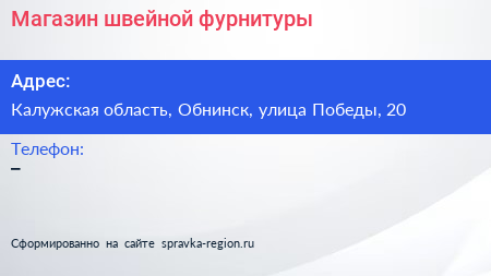 Магазин швейной фурнитуры по адресу Калужская область, Обнинск, улица Победы, 20 в дальнейшем Организация, размещена в следующих категориях: