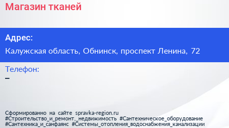 Магазин тканей по адресу Калужская область, Обнинск, проспект Ленина, 72 в дальнейшем Организация, размещена в следующих категориях: