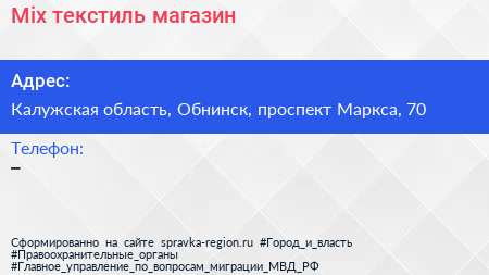 Mix текстиль, магазин по адресу Калужская область, Обнинск, проспект Маркса, 70 в дальнейшем Организация, размещена в следующих категориях: