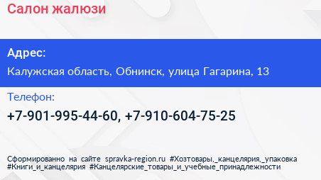 Салон жалюзи по адресу Калужская область, Обнинск, улица Гагарина, 13 в дальнейшем Организация, размещена в следующих категориях: