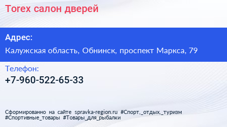 Torex, салон дверей по адресу Калужская область, Обнинск, проспект Маркса, 79 в дальнейшем Организация, размещена в следующих категориях: