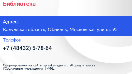 Библиотека по адресу Калужская область, Обнинск, Московская улица, 95 в дальнейшем Организация, размещена в следующих категориях: