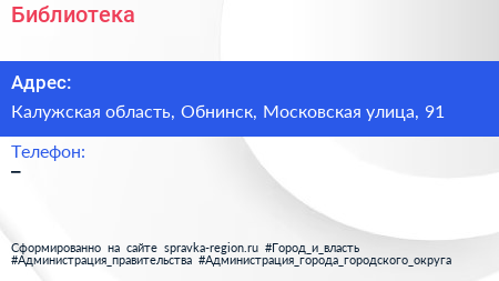 Библиотека по адресу Калужская область, Обнинск, Московская улица, 91 в дальнейшем Организация, размещена в следующих категориях: