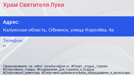 Храм Святителя Луки по адресу Калужская область, Обнинск, улица Королёва, 4а в дальнейшем Организация, размещена в следующих категориях: