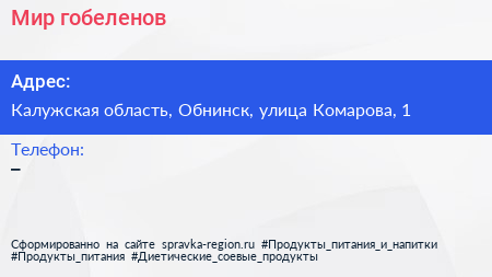 Мир гобеленов по адресу Калужская область, Обнинск, улица Комарова, 1 в дальнейшем Организация, размещена в следующих категориях: