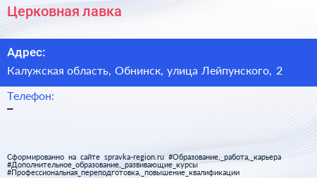 Церковная лавка по адресу Калужская область, Обнинск, улица Лейпунского, 2 в дальнейшем Организация, размещена в следующих категориях:
