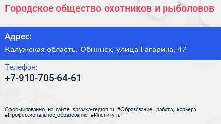 Городское общество охотников и рыболовов по адресу Калужская область, Обнинск, улица Гагарина, 47 в дальнейшем Организация, размещена в следующих категориях: