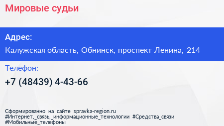 Мировые судьи по адресу Калужская область, Обнинск, проспект Ленина, 214 в дальнейшем Организация, размещена в следующих категориях: