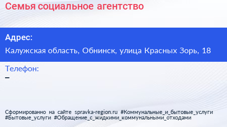 Семья, социальное агентство по адресу Калужская область, Обнинск, улица Красных Зорь, 18 в дальнейшем Организация, размещена в следующих категориях: