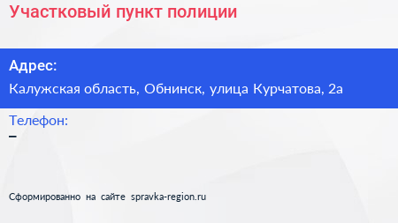 Участковый пункт полиции по адресу Калужская область, Обнинск, улица Курчатова, 2а в дальнейшем Организация, размещена в следующих категориях: