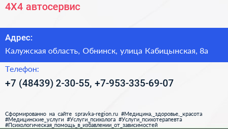 4X4, автосервис по адресу Калужская область, Обнинск, улица Кабицынская, 8а в дальнейшем Организация, размещена в следующих категориях:
