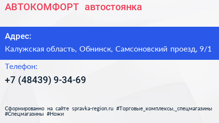АВТОКОМФОРТ+, автостоянка по адресу Калужская область, Обнинск, Самсоновский проезд, 9/1 в дальнейшем Организация, размещена в следующих категориях: