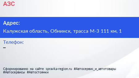 АЗС по адресу Калужская область, Обнинск, трасса М-3 111 км, 1 в дальнейшем Организация, размещена в следующих категориях: