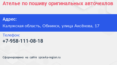 Ателье по пошиву оригинальных авточехлов по адресу Калужская область, Обнинск, улица Аксёнова, 17 в дальнейшем Организация, размещена в следующих категориях: