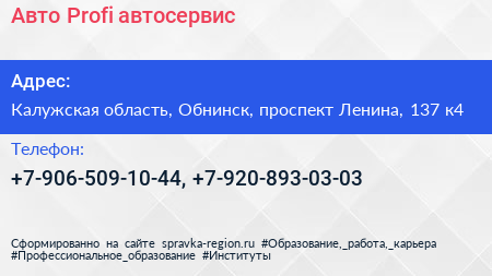 Авто Profi, автосервис по адресу Калужская область, Обнинск, проспект Ленина, 137 к4 в дальнейшем Организация, размещена в следующих категориях: