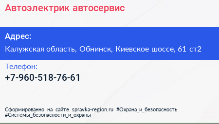 Автоэлектрик, автосервис по адресу Калужская область, Обнинск, Киевское шоссе, 61 ст2 в дальнейшем Организация, размещена в следующих категориях: