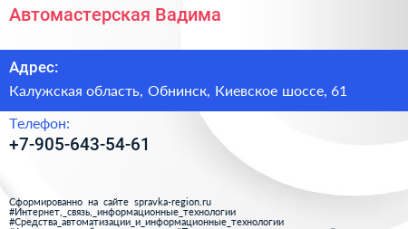 Автомастерская Вадима по адресу Калужская область, Обнинск, Киевское шоссе, 61 в дальнейшем Организация, размещена в следующих категориях: