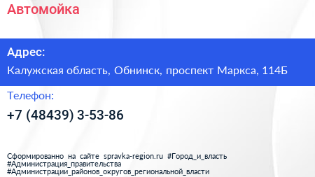 Автомойка по адресу Калужская область, Обнинск, проспект Маркса, 114Б в дальнейшем Организация, размещена в следующих категориях: