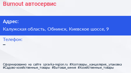 Burnout, автосервис по адресу Калужская область, Обнинск, Киевское шоссе, 9 в дальнейшем Организация, размещена в следующих категориях: