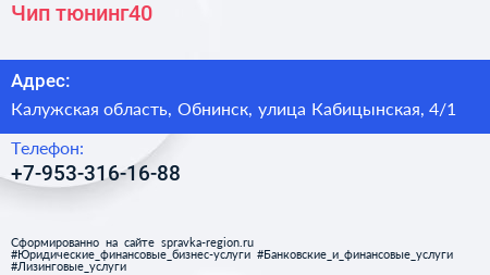 Чип-тюнинг40 по адресу Калужская область, Обнинск, улица Кабицынская, 4/1 в дальнейшем Организация, размещена в следующих категориях: