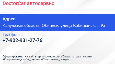 DoctorCar, автосервис по адресу Калужская область, Обнинск, улица Кабицынская, 9а в дальнейшем Организация, размещена в следующих категориях: