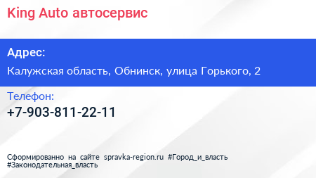 King-Auto, автосервис по адресу Калужская область, Обнинск, улица Горького, 2 в дальнейшем Организация, размещена в следующих категориях: