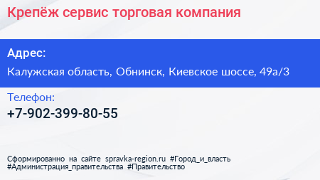 Крепёж сервис, торговая компания по адресу Калужская область, Обнинск, Киевское шоссе, 49а/3 в дальнейшем Организация, размещена в следующих категориях: