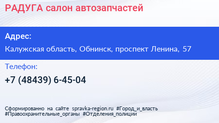 РАДУГА, салон автозапчастей по адресу Калужская область, Обнинск, проспект Ленина, 57 в дальнейшем Организация, размещена в следующих категориях: