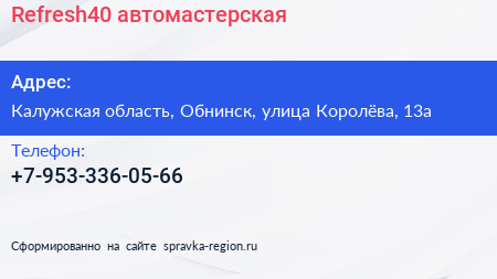 Refresh40, автомастерская по адресу Калужская область, Обнинск, улица Королёва, 13а в дальнейшем Организация, размещена в следующих категориях: