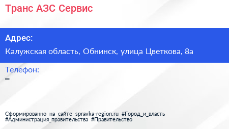 Транс АЗС-Сервис по адресу Калужская область, Обнинск, улица Цветкова, 8а в дальнейшем Организация, размещена в следующих категориях: