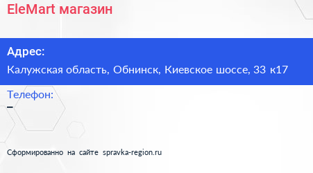 EleMart, магазин по адресу Калужская область, Обнинск, Киевское шоссе, 33 к17 в дальнейшем Организация, размещена в следующих категориях: