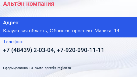 АльтЭн, компания по адресу Калужская область, Обнинск, проспект Маркса, 14 в дальнейшем Организация, размещена в следующих категориях: