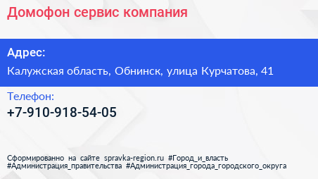 Домофон-сервис, компания по адресу Калужская область, Обнинск, улица Курчатова, 41 в дальнейшем Организация, размещена в следующих категориях: