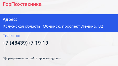 ГорПожтехника по адресу Калужская область, Обнинск, проспект Ленина, 82 в дальнейшем Организация, размещена в следующих категориях:
