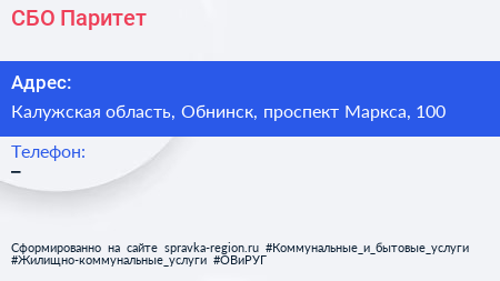 СБО-Паритет по адресу Калужская область, Обнинск, проспект Маркса, 100 в дальнейшем Организация, размещена в следующих категориях: