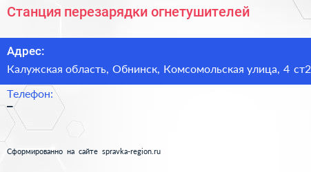 Станция перезарядки огнетушителей по адресу Калужская область, Обнинск, Комсомольская улица, 4 ст2 в дальнейшем Организация, размещена в следующих категориях: