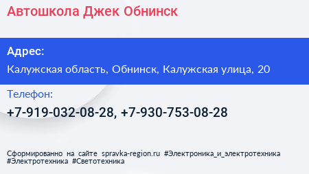 Автошкола Джек Обнинск по адресу Калужская область, Обнинск, Калужская улица, 20 в дальнейшем Организация, размещена в следующих категориях: