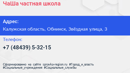 ЧаШа, частная школа по адресу Калужская область, Обнинск, Звёздная улица, 3 в дальнейшем Организация, размещена в следующих категориях: