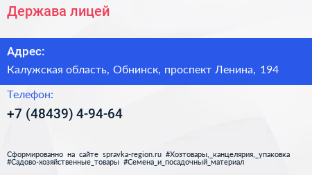 Держава, лицей по адресу Калужская область, Обнинск, проспект Ленина, 194 в дальнейшем Организация, размещена в следующих категориях: