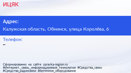 ИЦЯК по адресу Калужская область, Обнинск, улица Королёва, 6 в дальнейшем Организация, размещена в следующих категориях: