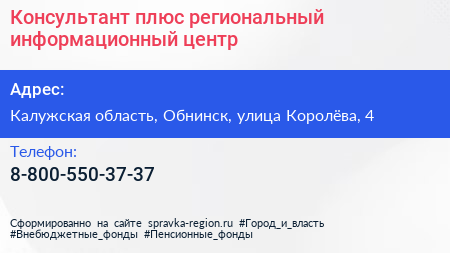 Консультант плюс, региональный информационный центр по адресу Калужская область, Обнинск, улица Королёва, 4 в дальнейшем Организация, размещена в следующих категориях: