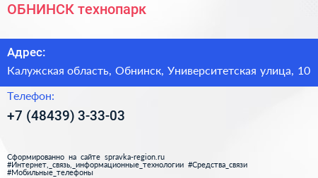 ОБНИНСК, технопарк по адресу Калужская область, Обнинск, Университетская улица, 10 в дальнейшем Организация, размещена в следующих категориях: